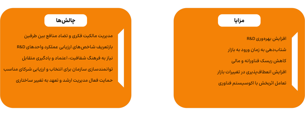 • افزایش بهره‌وری R&D: با تمرکز منابع داخلی روی توسعه فناوری‌های استراتژیک و استفاده از منابع بیرونی برای سایر نیازها.